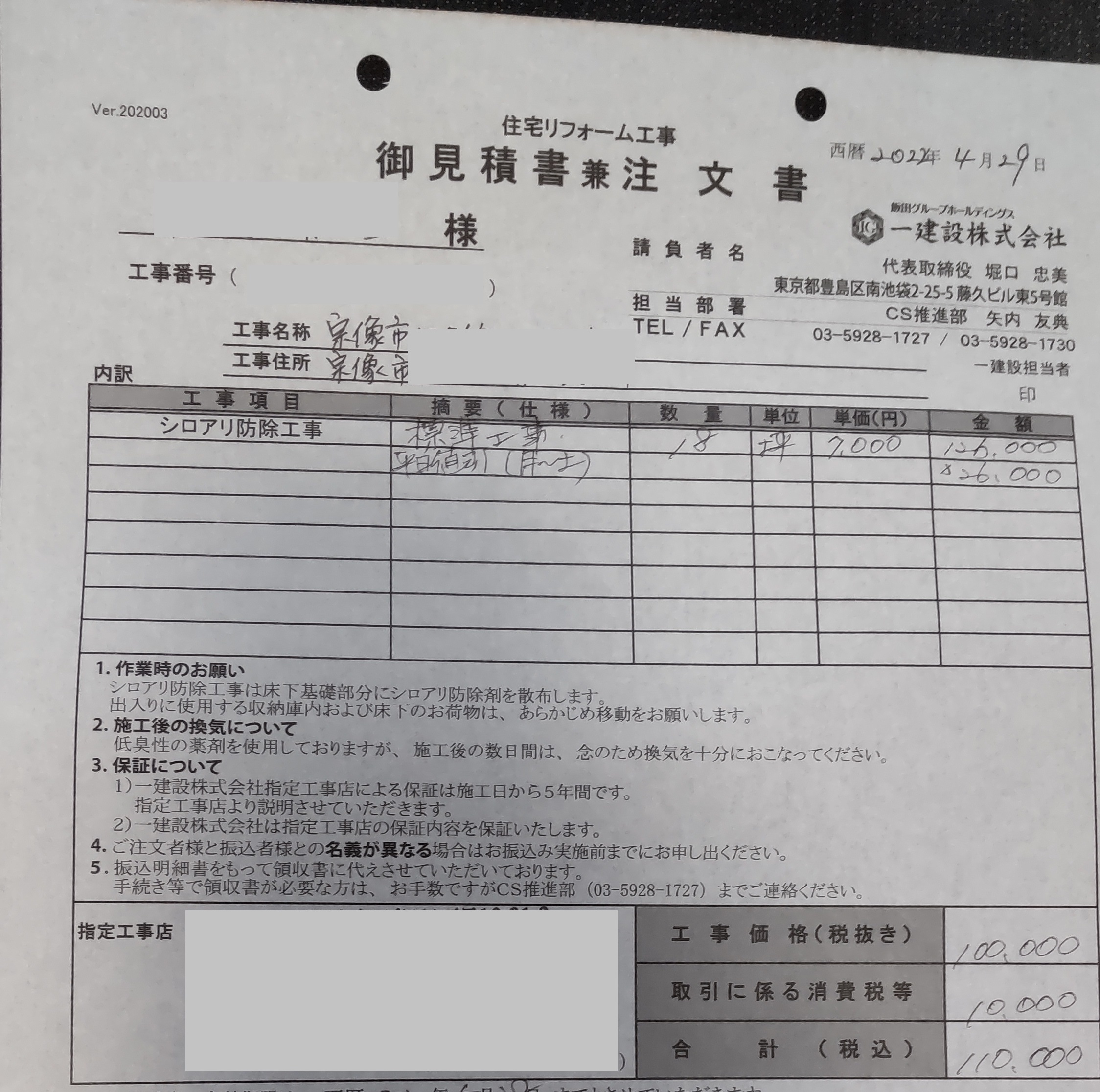 「一建設」にシロアリ防除工事をお願いしました。2022年4月29日