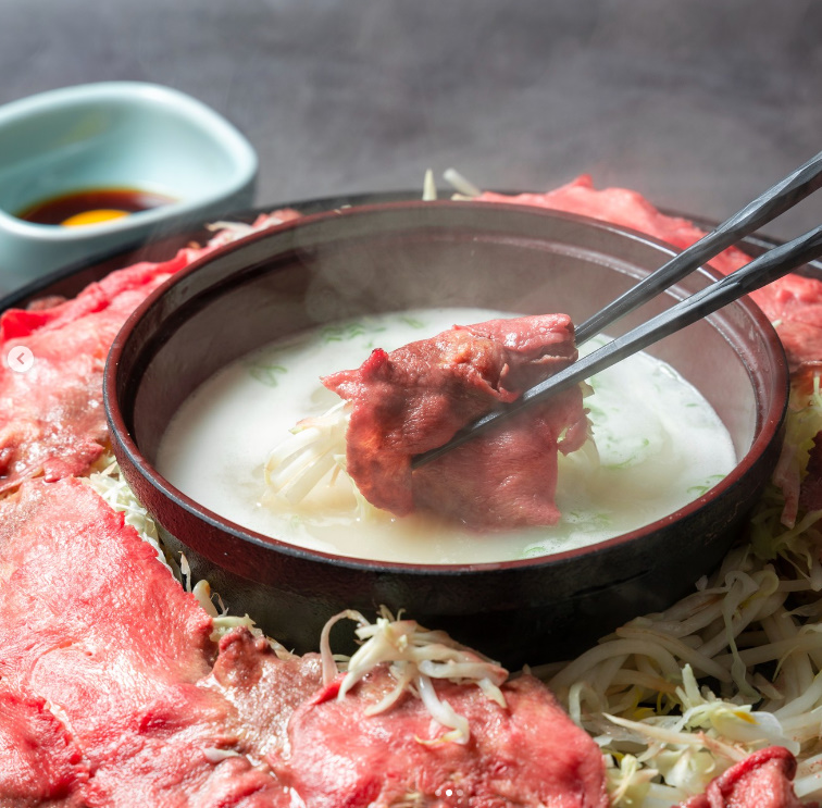 鶏白湯スープに牛タンで野菜(キャベツともやし)を巻いて入れ、