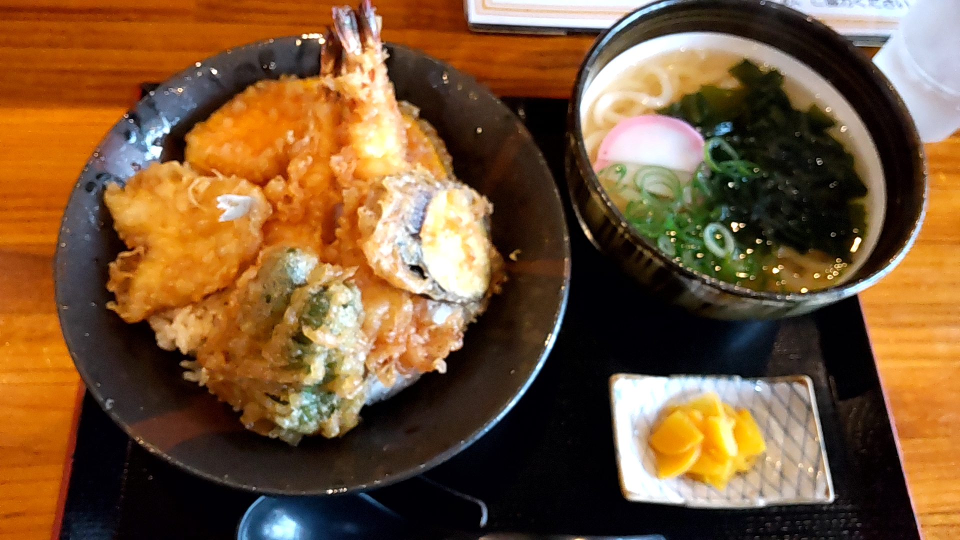 普通の天丼より甘めのたれが掛かっており、このたれでご飯が進みます。天ぷらにも甘いたれが合っていてて美味しい。うどんもですが、丼物も美味しいお店です。