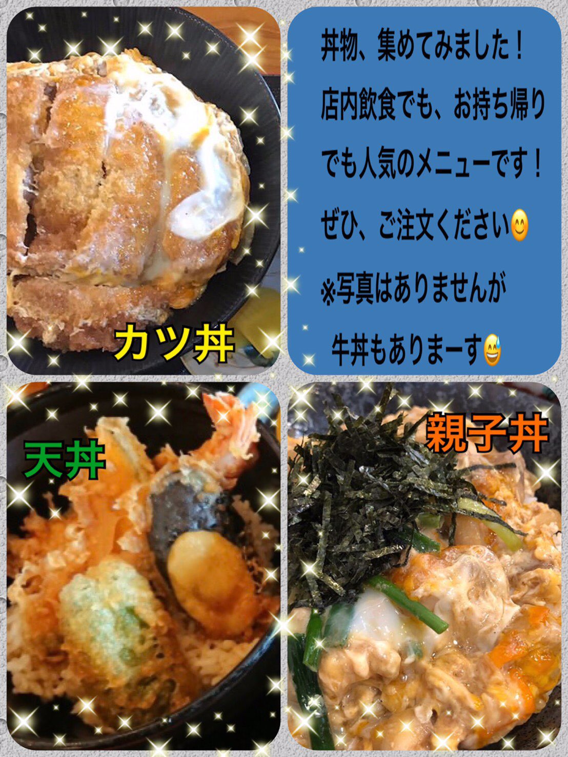 丼ものが4種類。牛丼、カツ丼、天丼、親子丼と種類が多い。